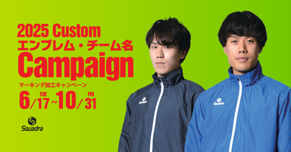 今年もスクアドラはチーム様向けに一度に対象品番を5着以上のご注文で1か所エンブレムやチーム名などのマーキング加工をサービスするキャンペーンを実施いたします。こちらのお得なキャンペーンは2025年6月17日~2025年10月31日での期間限定キャンペーンとなりますので、ぜひお早めにご注文くださいませ。