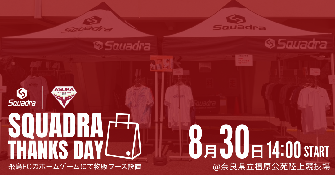 スクアドラは飛鳥FCサポーターの皆様への日頃の感謝を込めて、特別価格にてスクアドラブースを出店いたします。すぐ活躍いただける半袖Tシャツやハーフパンツなども特別価格にて販売いたしますにで、ぜひこの機会にお買い求めください。