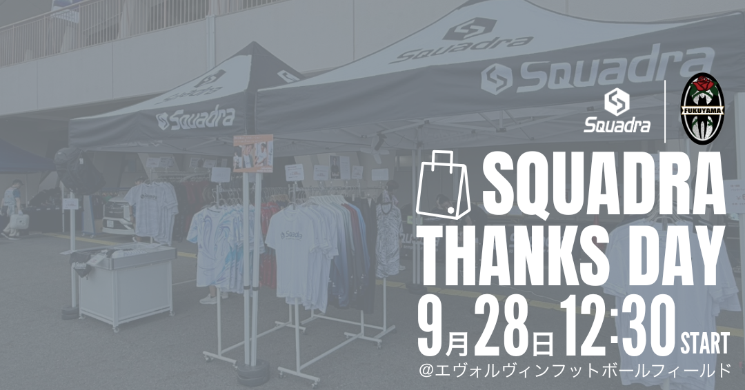 スクアドラは 9月28日 (日) に行われる、中国サッカーリーグの福山シティFCのホームゲーム (vs SRC広島) において、優勝を記念して物販ブースを設置いたします。